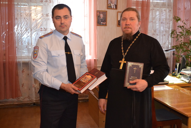 10 ноября, в День сотрудника органов внутренних дел РФ, благочинный Репьевского церковного округа протоиерей Алексий Чибисов провел встречу с личным составом районного отдела полиции с. Репьевка, поздравил их с профессиональным праздником и передал в дар для библиотеки отдела Библию, Святое Евангелие, Закон Божий и святоотеческую литературу.